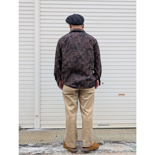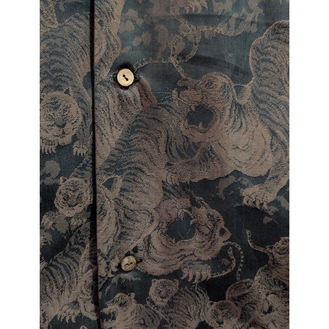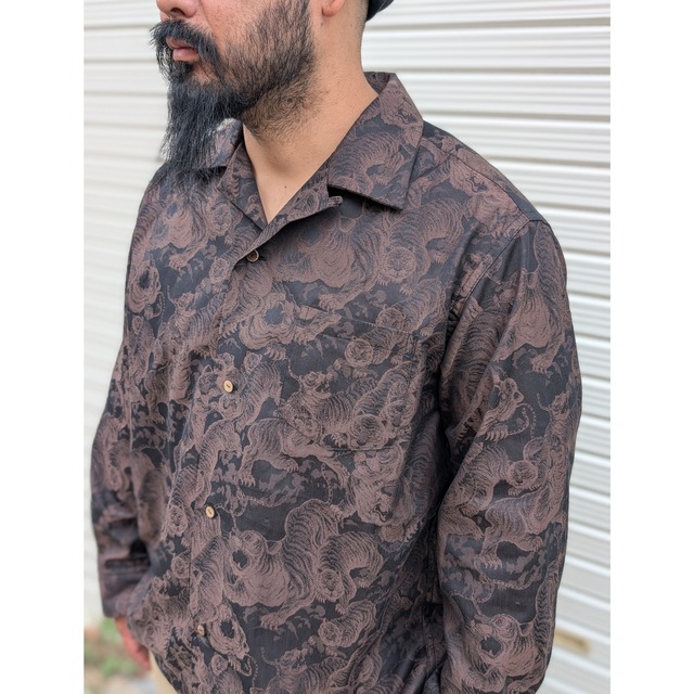 [百虎ジャガード アロハシャツ] color : ブラウン size : XL 着丈 70 肩幅 51 身幅 61 袖丈 58 日常でも着れる着物をテーマに! 日本人として着物は着たい!けど日常に取り入れにくい、、 そんな思いから作られた着物ボーリングシャツ。 夏のイメージが強いアロハシャツを、シーズンレスに楽しめる落ち着いたカラーとロングスリーブ仕様で仕立てました! 無数の虎が躍動する、圧倒的な迫力の総柄シャツ♫ シャツとしても、羽織としても主役になれる一枚です✨️ ※店頭にて同時販売しておりますので、無くなり次第終了となります。 ※1着1着が1点物のアイテムになりますので、柄の配置などがそれぞれ異なります。予めご了承ください。