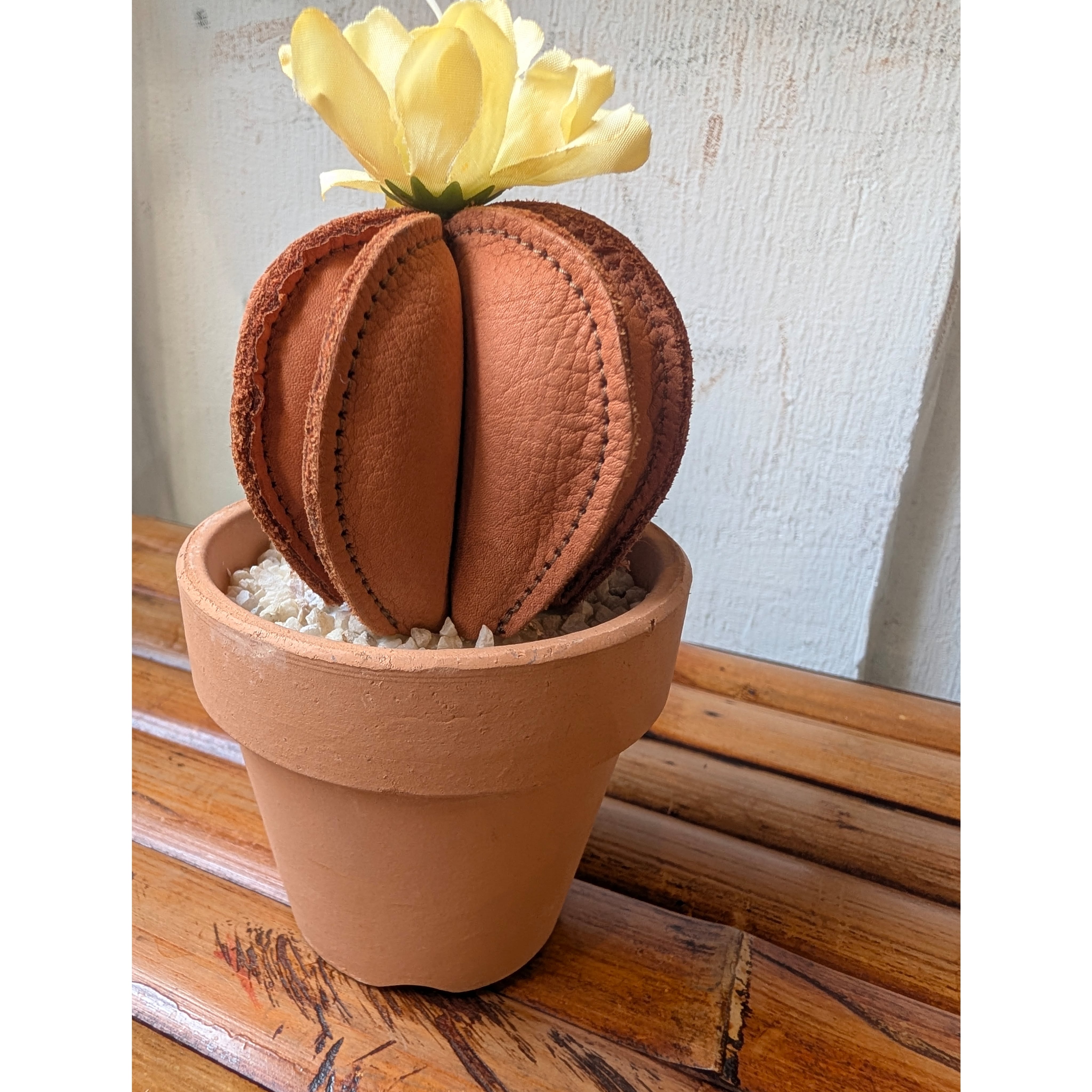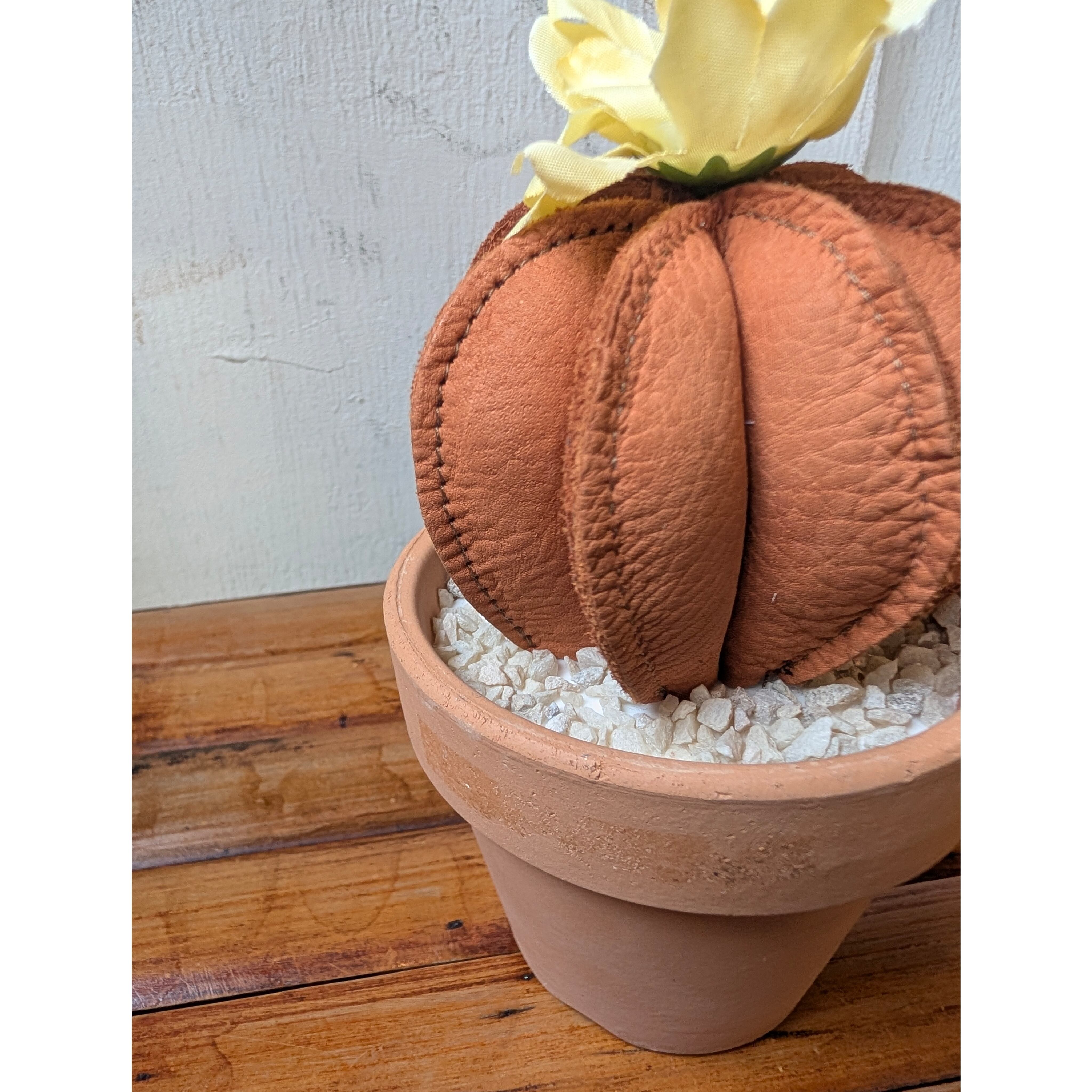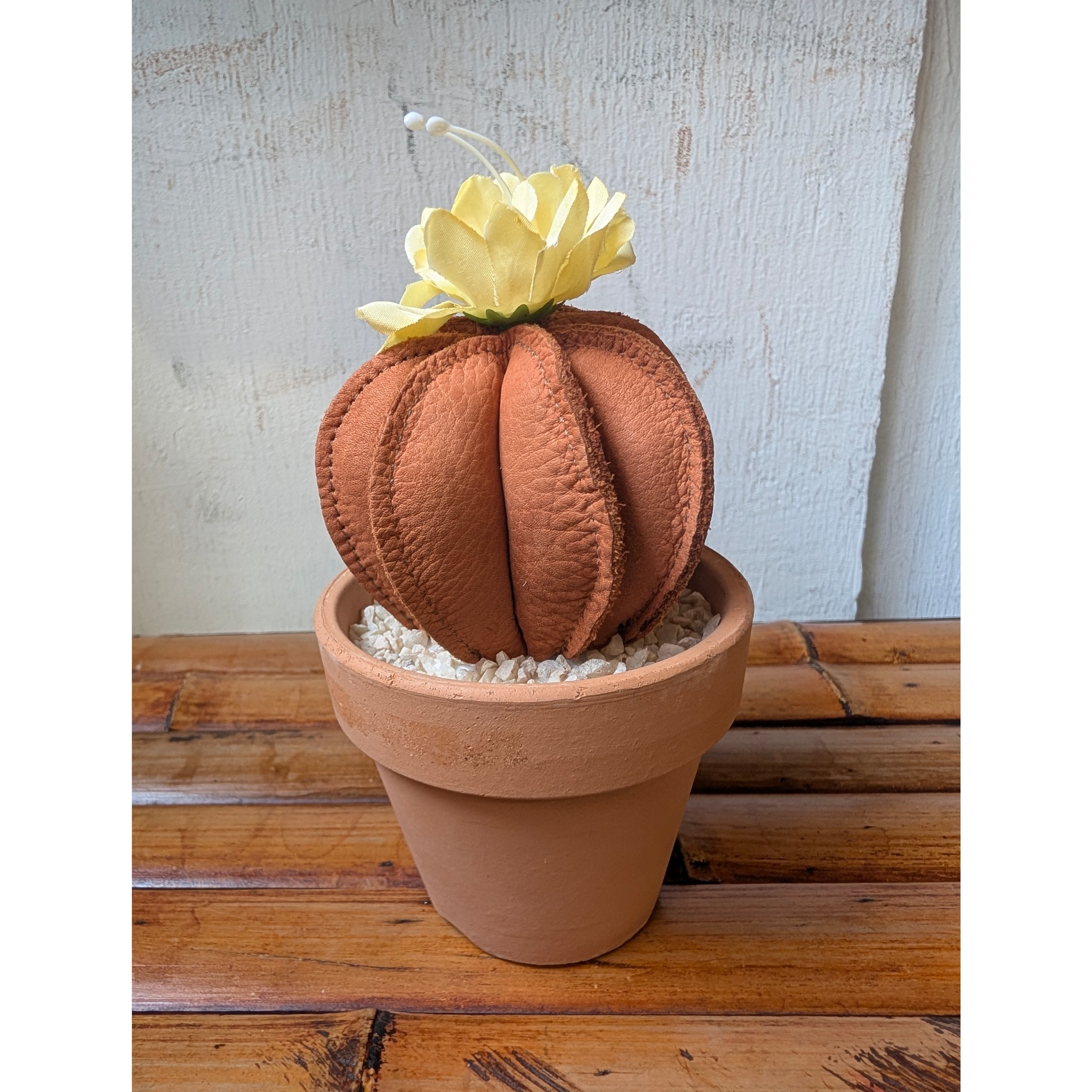 Leather Cactus [Brown×Yellow] size : S 縦8㎝×横6.5㎝(鉢は含まない) ※革の表情は商品毎に、パーツ毎に変わりますので写真の商品と同じ様な仕上がりにはなりません。1着1着が1点物のアイテムになりますので予めご了承ください。 ※尚、店頭にて同時販売しておりますので、無くなり次第終了となります。