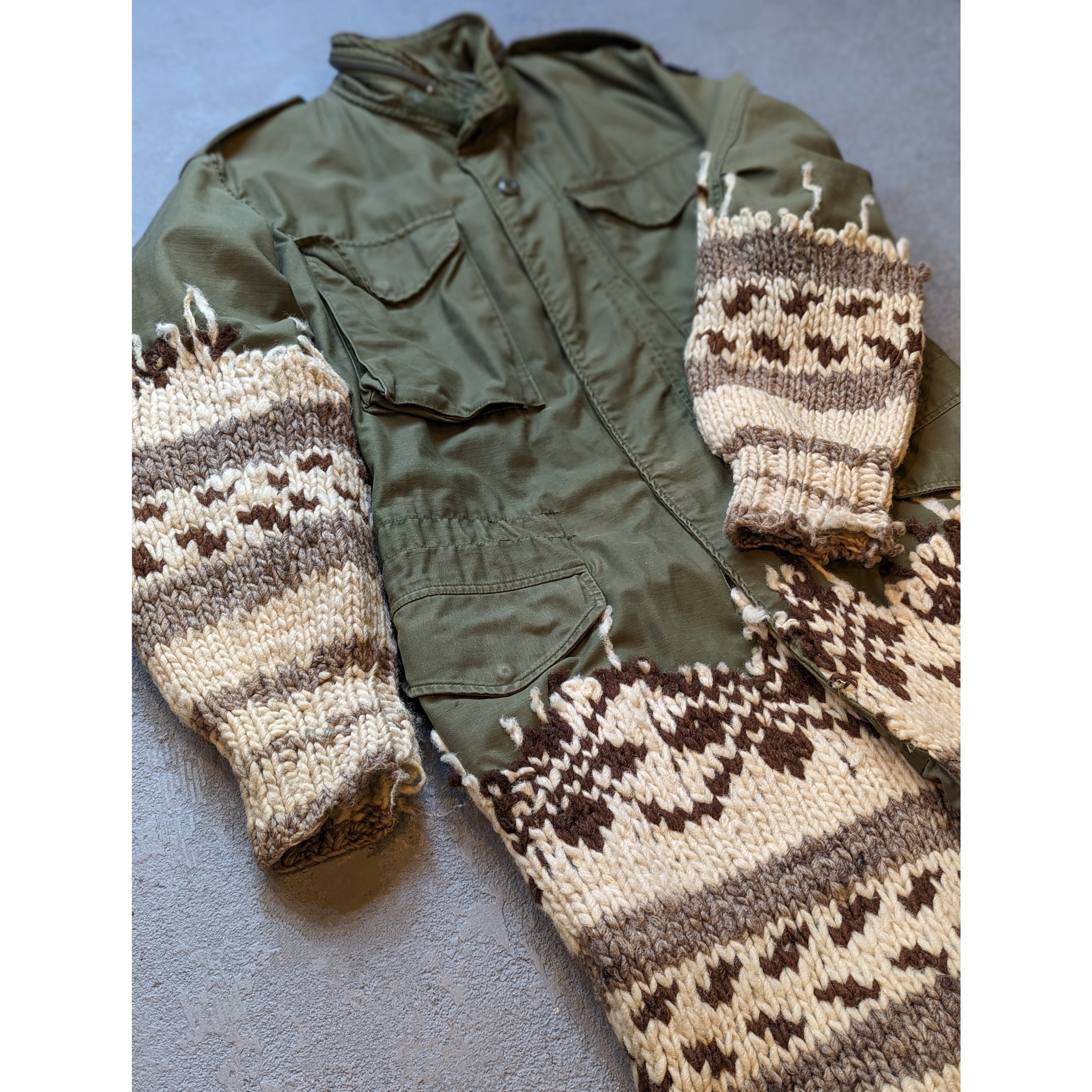 M-65フィールドジャケットと、Vintageのカウチンニットをドッキングさせて一着にしました。 ファスナーは“アルカナファスナー”に変更しています。 着丈 110㎝ 肩幅 50㎝ 身幅 58㎝ 袖丈 64㎝ ※古着の醍醐味である小穴や小汚れが一部見られます。 ※尚、店頭にて同時販売しておりますので、無くなり次第終了となります。