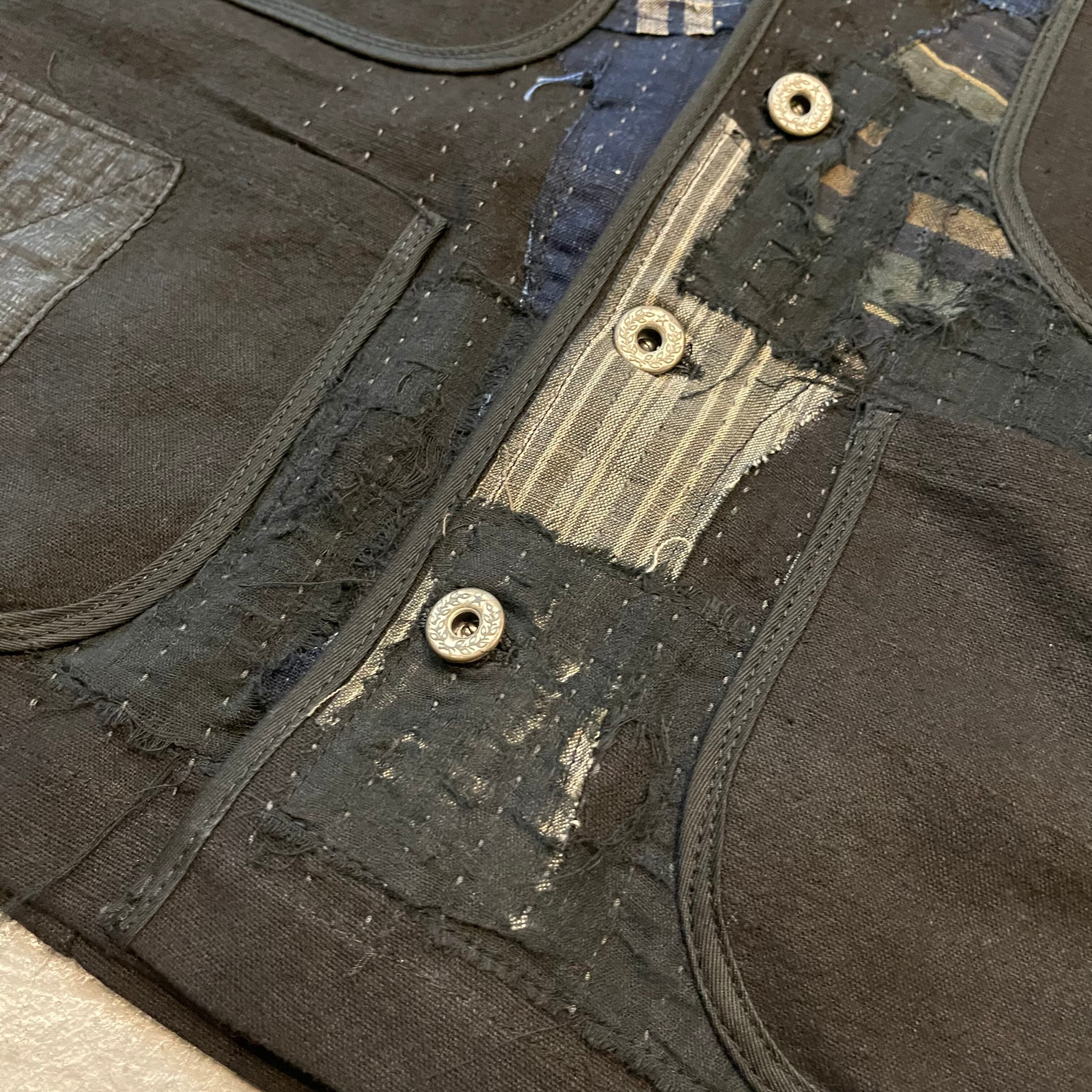 約100年ほど前のフレンチアンティークの生成りリネン生地を自社で黒色に染め上げた、このARCANA BLACK LINEN BORO ENGINEER JACKETは、こちらも約100年ほど前の日本の古布やボロ生地を縫い合わせて独特の風合いを演出しています。ユニークなデザインで、他とは一線を画す無骨なデザインが魅力です。 ※製品の特性上、色落ちや色移りが起こる可能性があります。洗濯時はくれぐれもご注意ください。 平置きサイズ 着丈60cm 身幅60cm 袖丈76cm(ラグラン) 袖口15cm