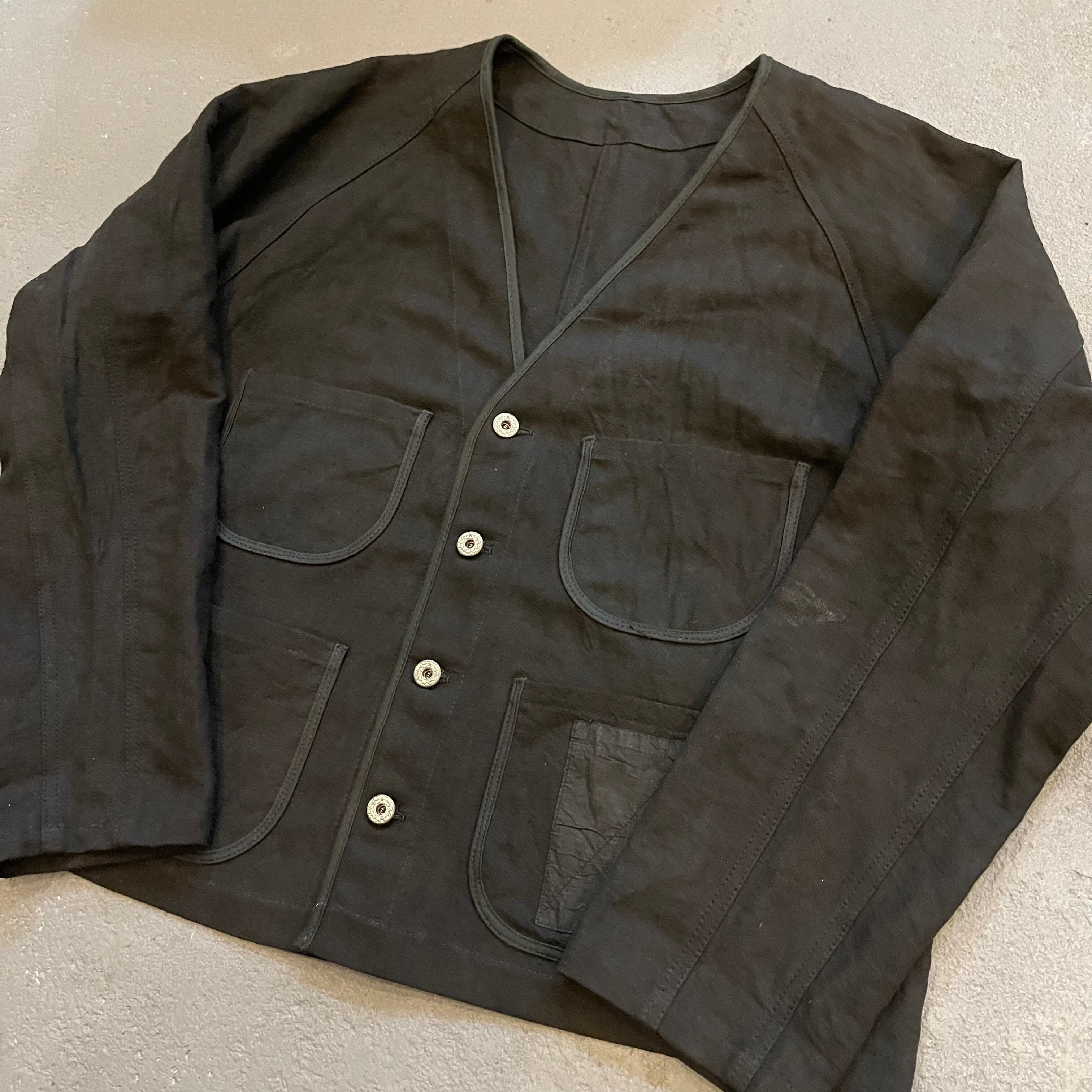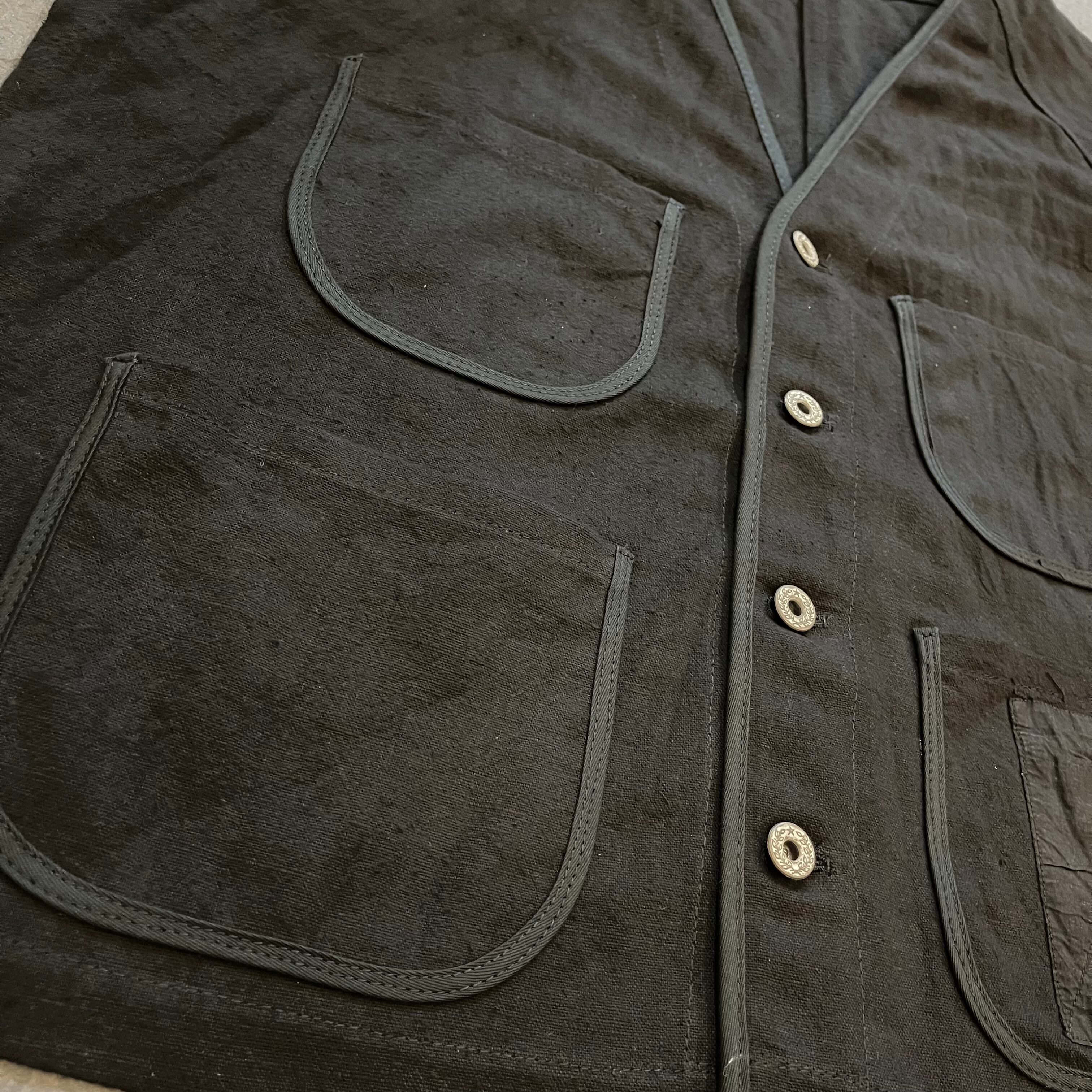 約100年ほど前のフレンチアンティークの生成りのリネン生地を自社で黒色に染め上げた、このARCANA BLACK LINEN ENGINEER JACKETはユニークなデザインで、他とは一線を画す無骨なデザインが魅力です。 ※製品の特性上、色落ちや色移りが起こる可能性があります。洗濯時はくれぐれもご注意ください。 平置きサイズ 着丈60cm 身幅60cm 袖丈76cm(ラグラン) 袖口15cm