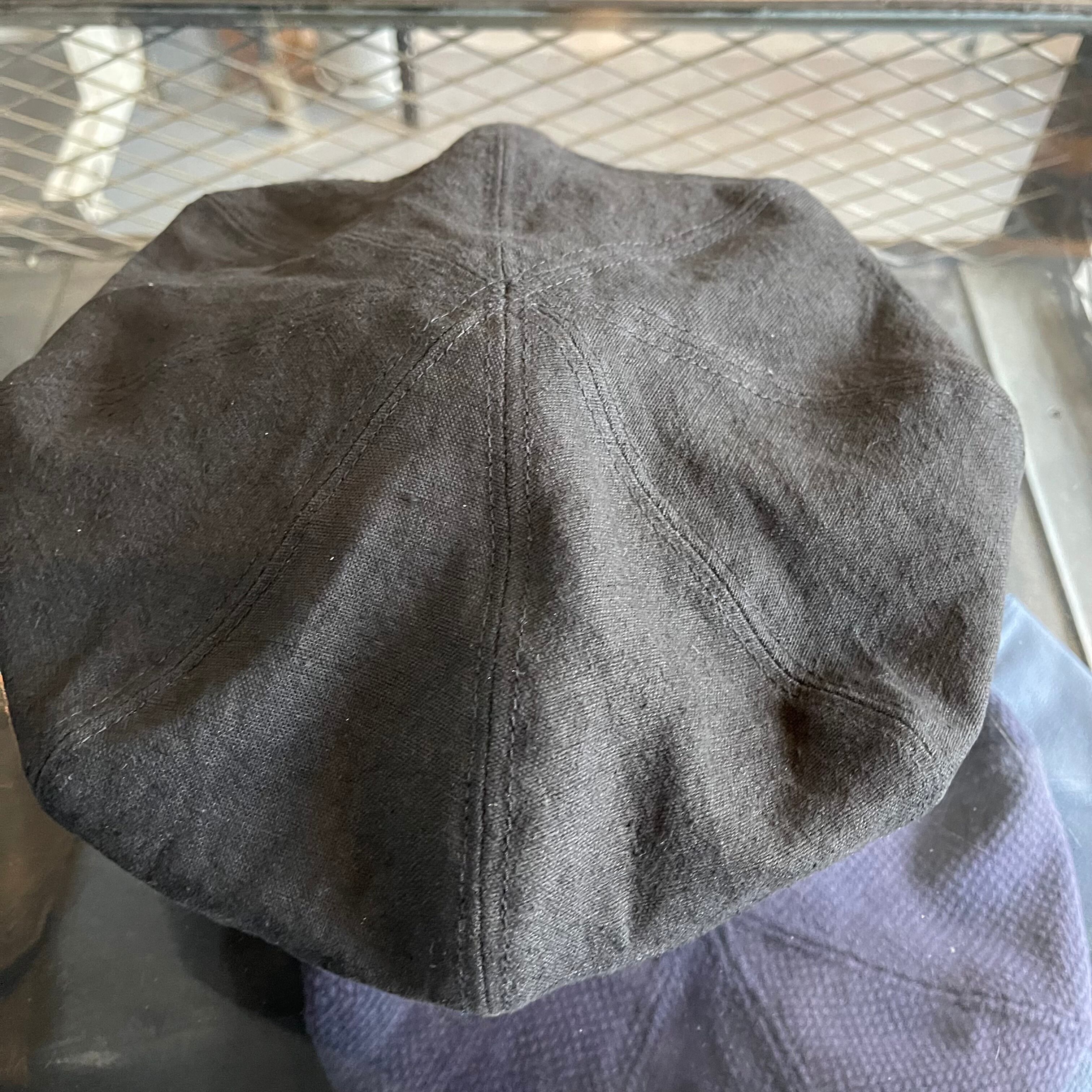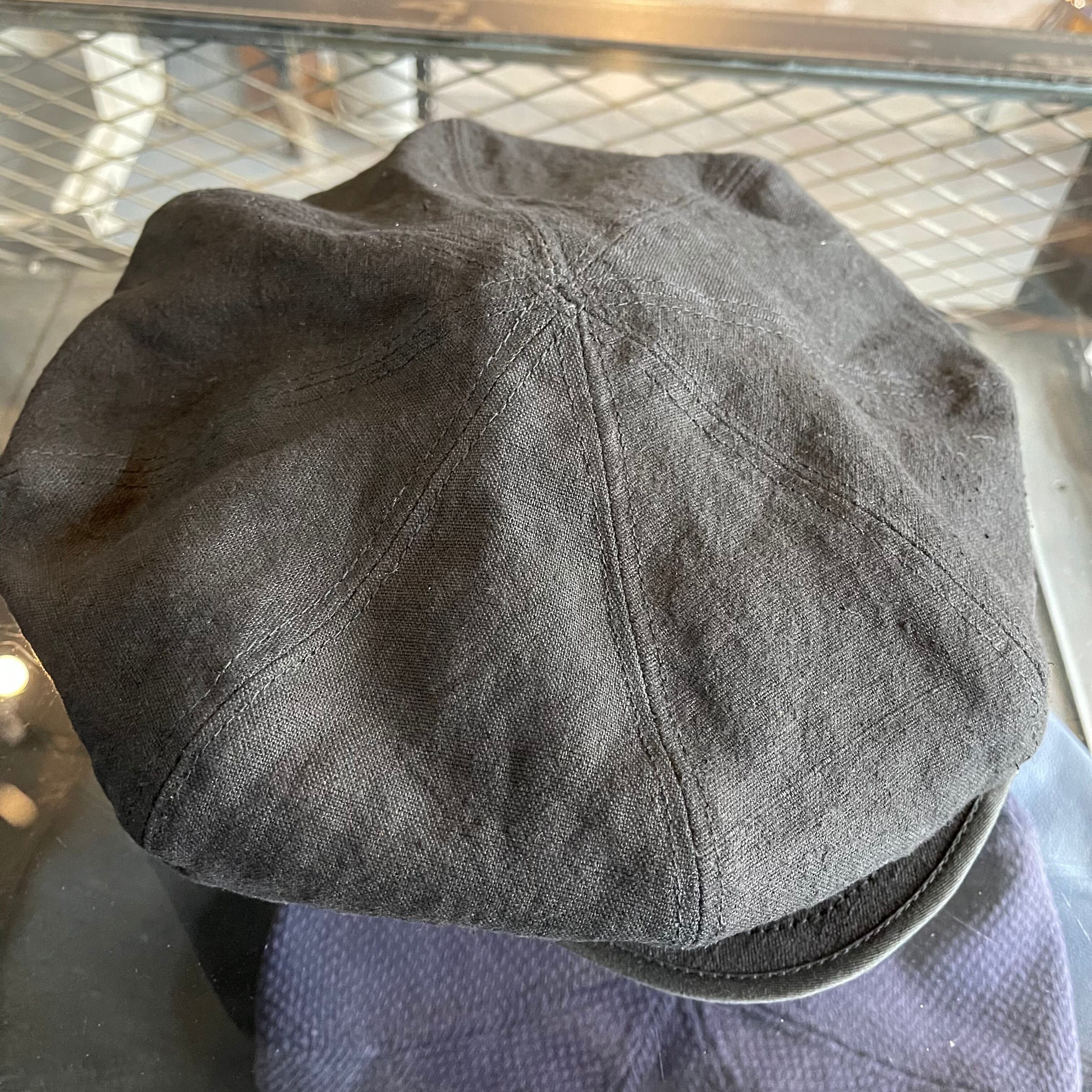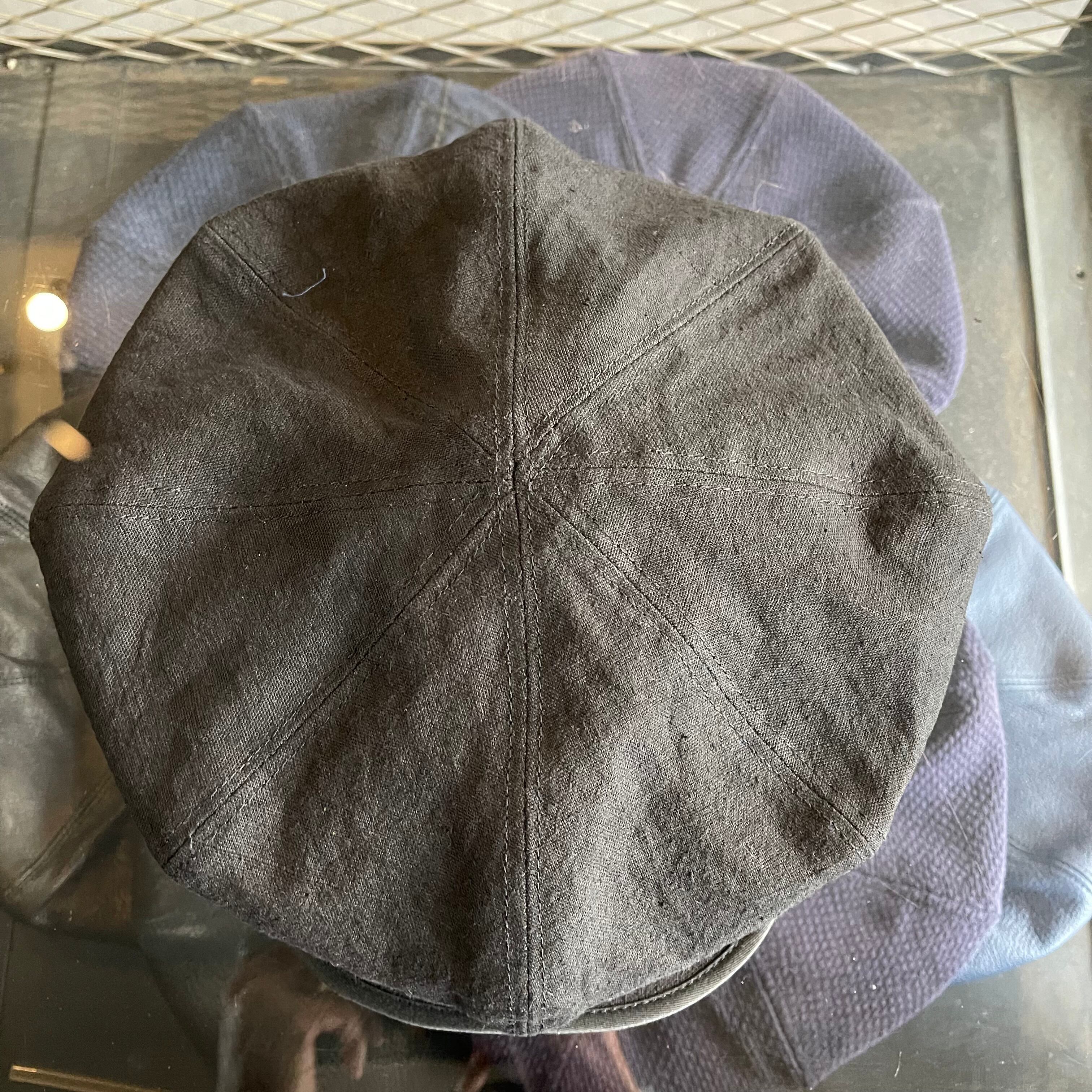 約100年ほど前のフレンチアンティークの生成りリネン生地を自社で黒色に染め上げた、このARCANA BLACK LINEN NEWSBOY CAP。ユニークなデザインで、他とは一線を画す無骨なデザインが魅力です。 ※製品の特性上、色落ちや色移りが起こる可能性があります。洗濯時はくれぐれもご注意ください。 サイズ 約57〜62cm