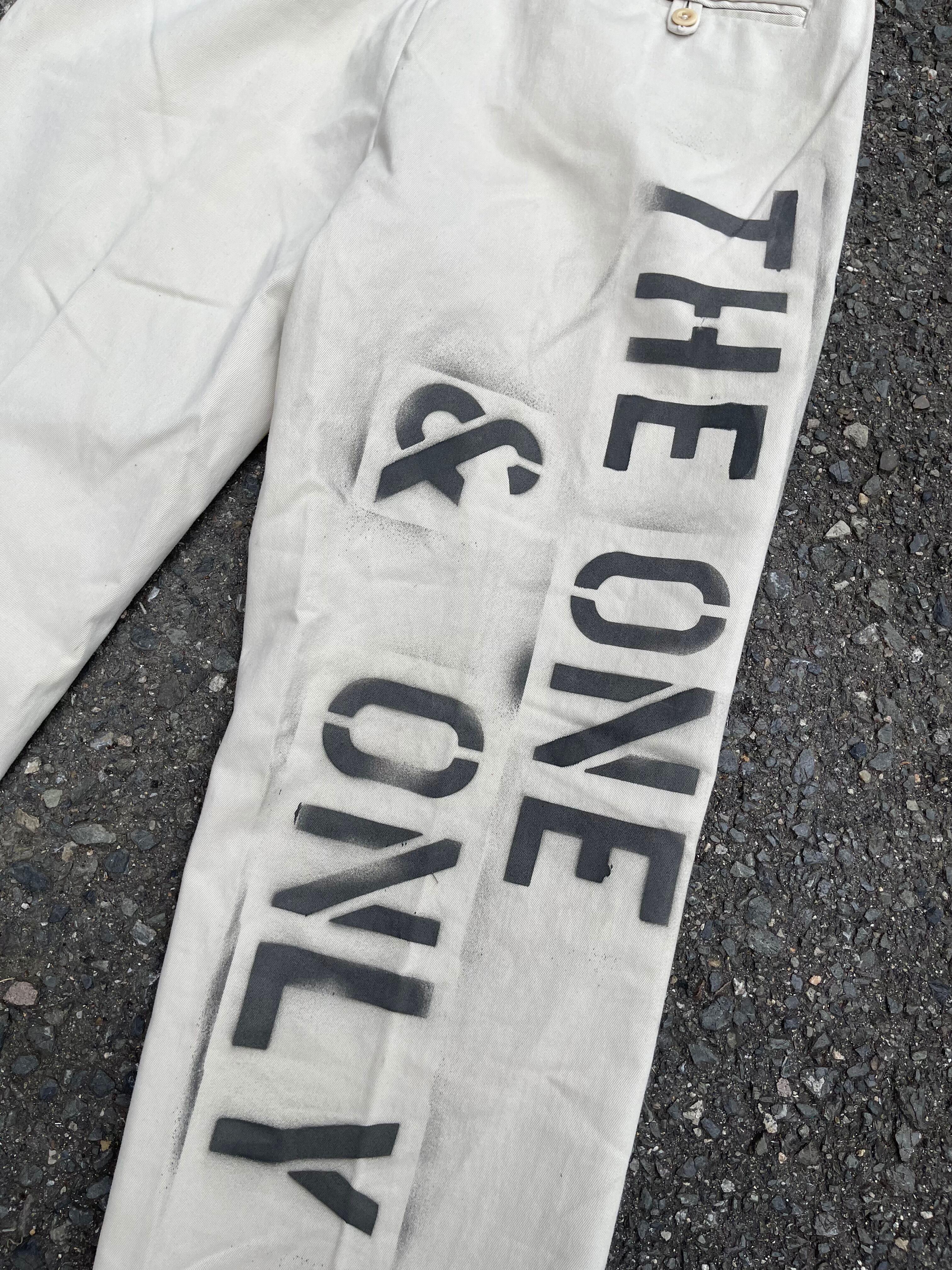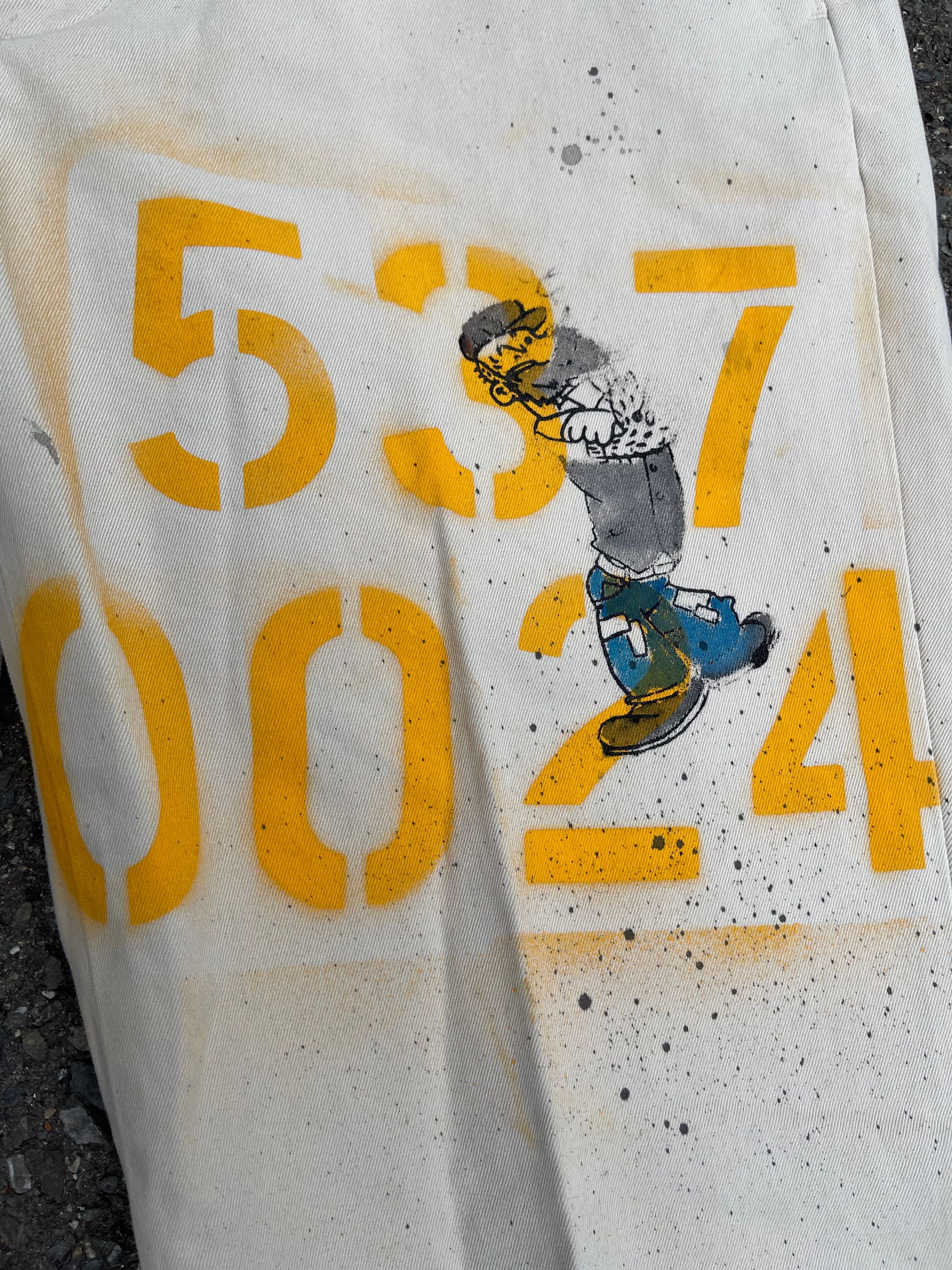 商品説明 ハンドペイント加工を施しメモリアルパンツを作成しました! ジエンドメンバーを描いたユニークなデザインとなってます! 唯一無二の逸品を是非! size.31 ウエスト42cm/84cm 股上33cm 股下79cm ワタリ32cm/64cm 裾幅21cm/42cm