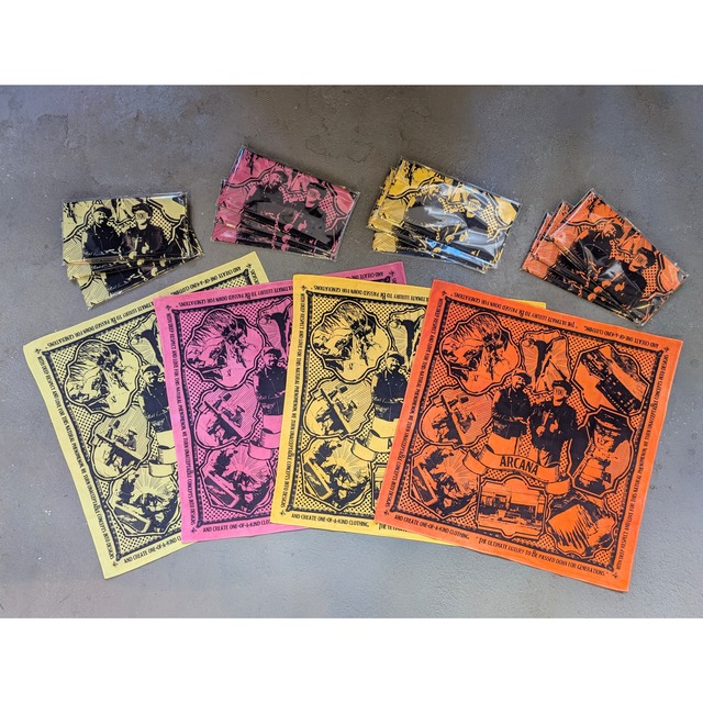 ARCANA BANDANA color : orange , yellow , pink , light green size : 53×53 ※こちらは手染めの為、一点一点の色合いの違いなどはご了承ください ※店頭にて同時販売しておりますので、無くなり次第終了となります。
